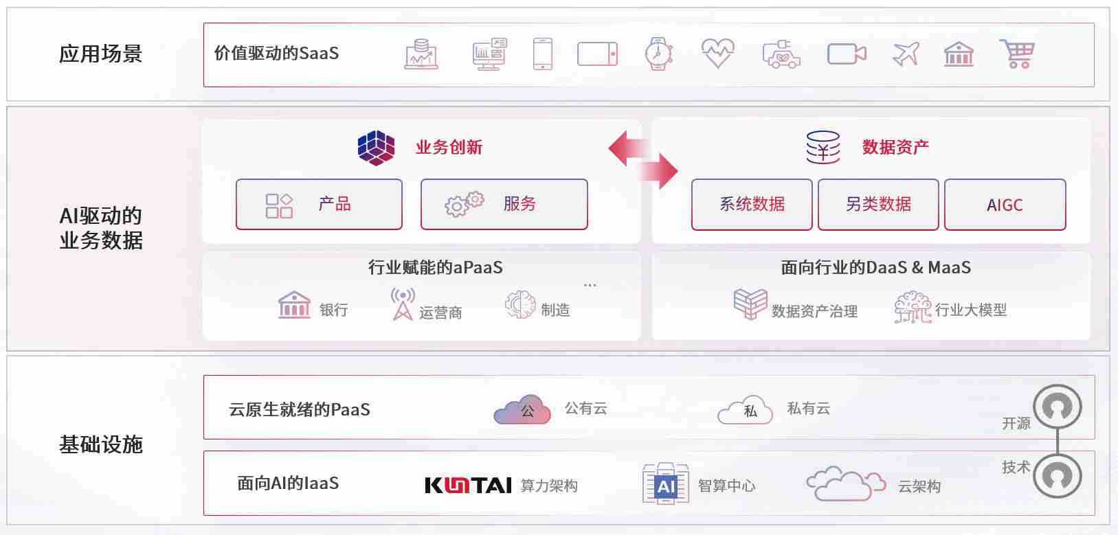 数字时代,,围绕企业数字化转型的关键要素,,,,申博官网数码开创性的提出数云融合战略和技术体系框架,,着力在云原生、、、、数字原生、、、、AI原生和信创产业上架构产品和服务能力,,为处在不同数字化转型阶段的快消零售、、汽车、、、金融、、医疗、、、、政企、、、、教育、、运营商等行业客户提供泛在的敏捷IT能力和融合的数据驱动能力,,构建跨界融合创新的数字业务场景和新业务模式,,,助力企业级客户建立面向未来的核心能力和竞争优势,,,,全面推动社会的数字化、、、、智能化转型升级。。。