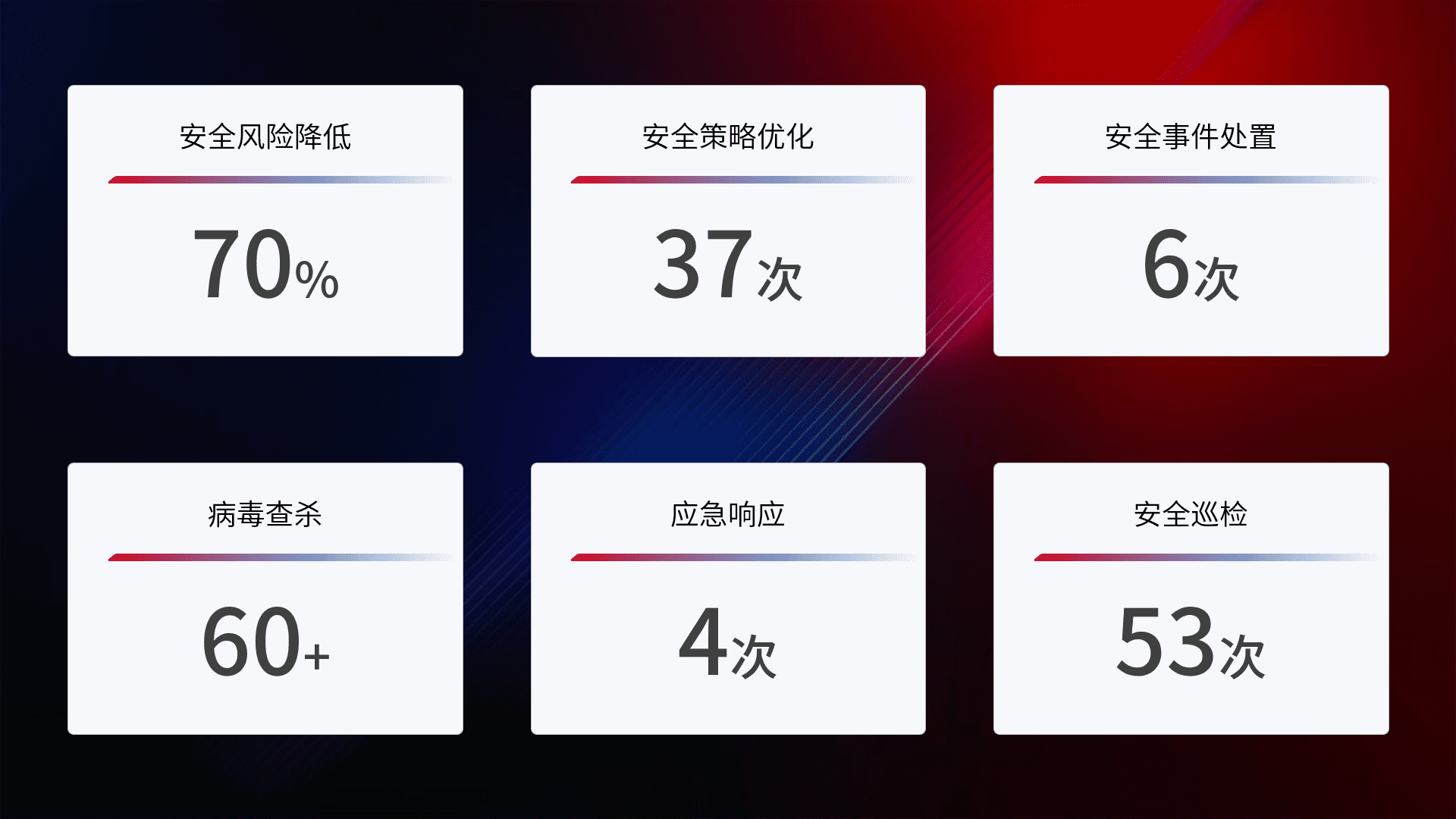 提供全面的安全事件报告体系,,,包括处置报告、、周报、、、季度和年度总结,,,结合持续监控,,帮助客户深入了解网络安全状况。。