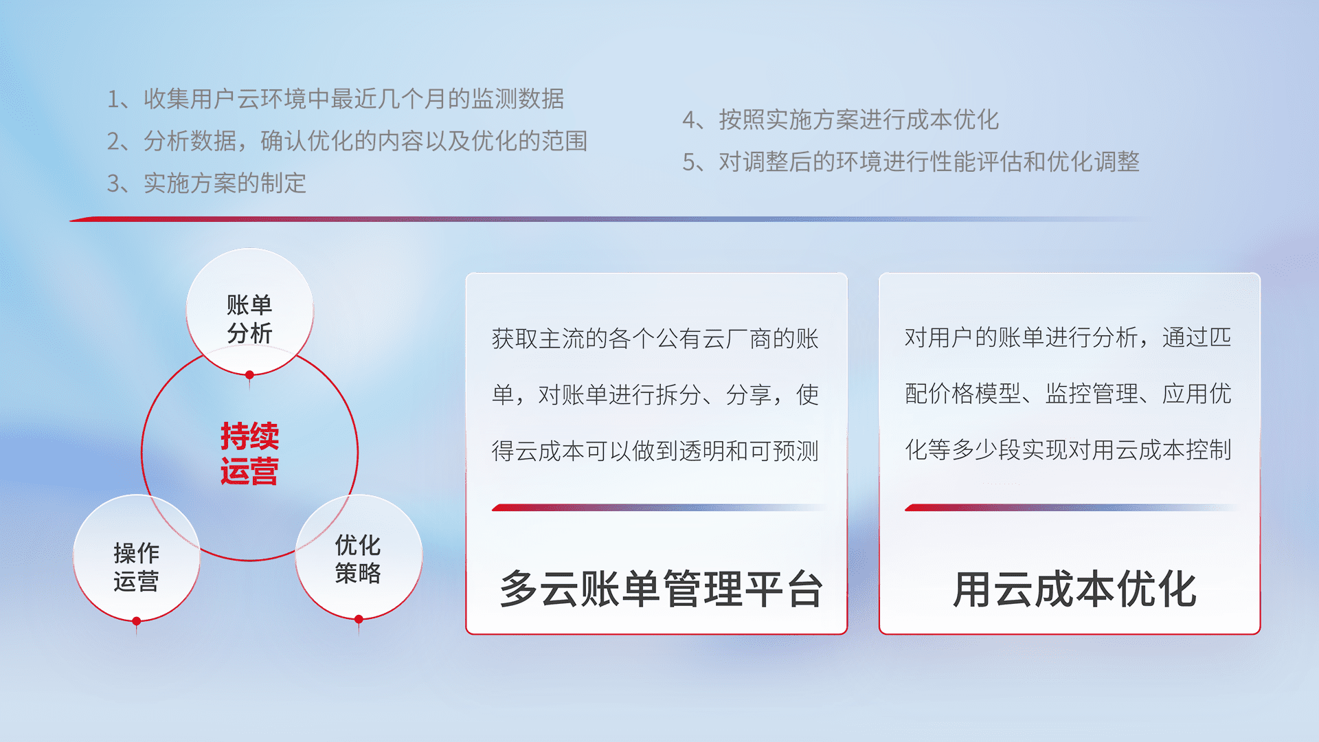 通过多云纳管,,,以统一的资源数据模型把客户的云资源进行抽象和封装,,,,进而实现对多云资源的统一操作,,保障云资源管理的可靠性、、、、稳定性与可用性。。量身定制化运维内容,,配置、、开发运维、、、、补丁管理、、、备份、、监控、、认证和访问管理、、、、审计和日常巡检等,,保障在用云过程中的可靠度,,稳定度以及高可用率。。。。